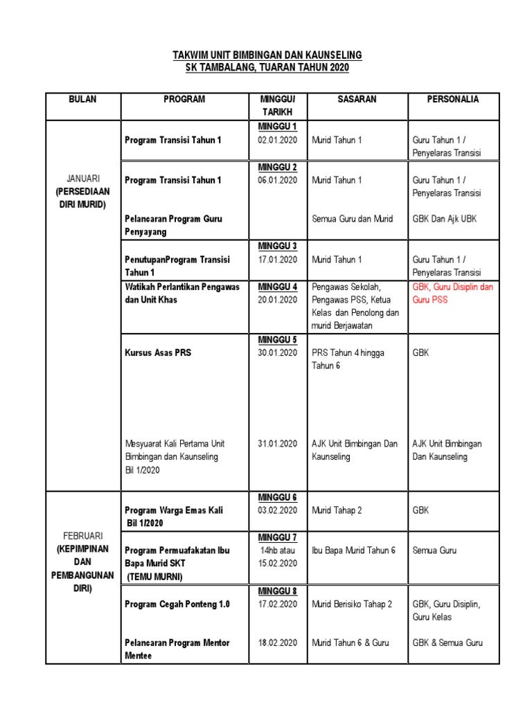 Takwim Unit Bimbingan Dan Kaunseling 2020 Skt Pdf